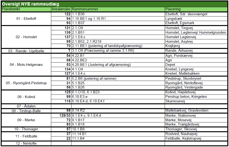 3: Nye rammeudlæg i både by- og landzone: 32. Heraf vedrører fem udlæg landsbyer, tre vedrører eksisterende virksomheders organiske vækst, fire er en ændring i anvendelse i eksisterende by, to er huludfyldning i eksisterende (lands)by, to er landzoneafslutning af en eksisterende by og to er nye erhvervsområder. Skemaet er opdateret efter vedtagelsen af kommuneplan 2024.