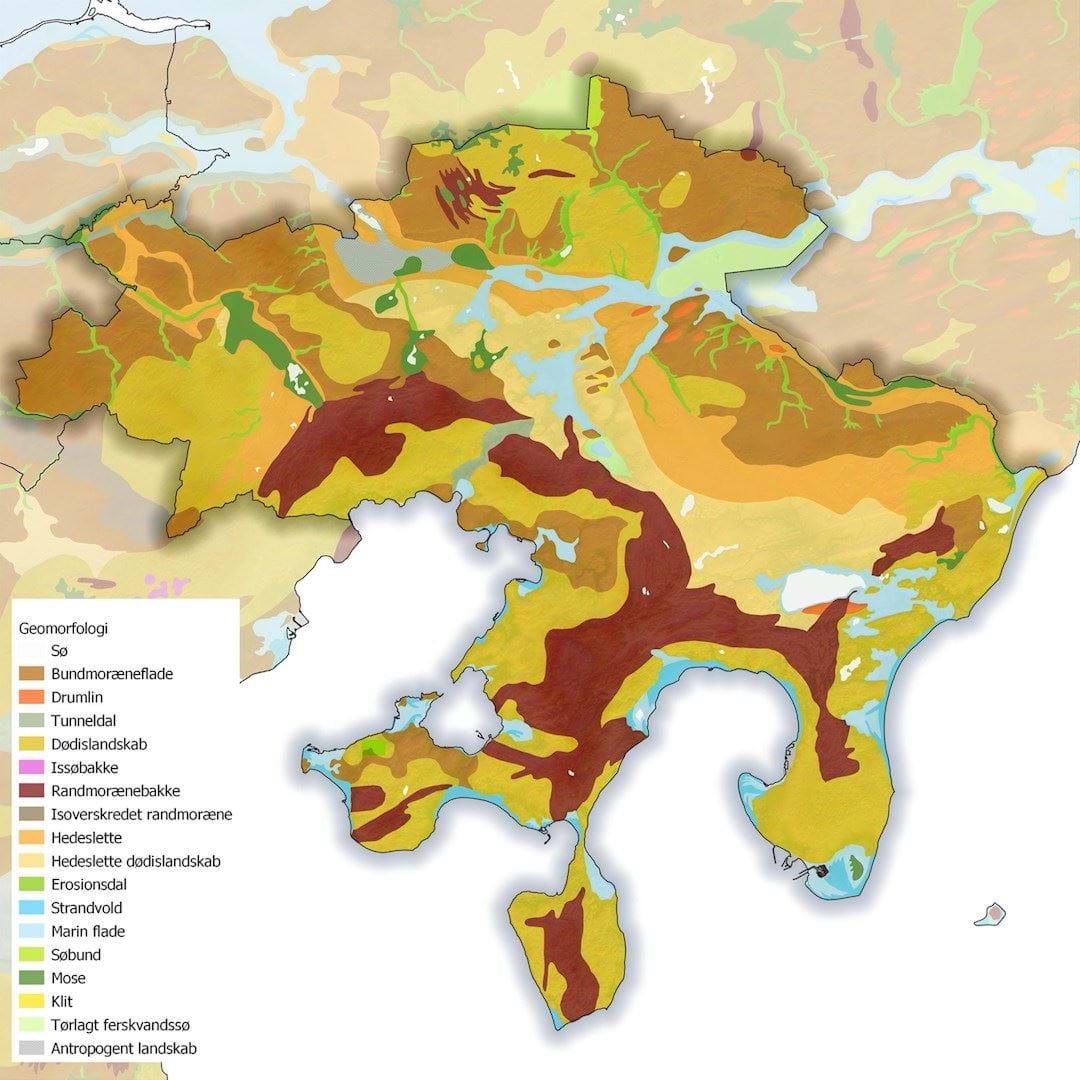 Enkelte steder gennemskæres de høje morænebakker af lavtliggende smeltevandssletter, store lavbundsflader, ådale og søer.