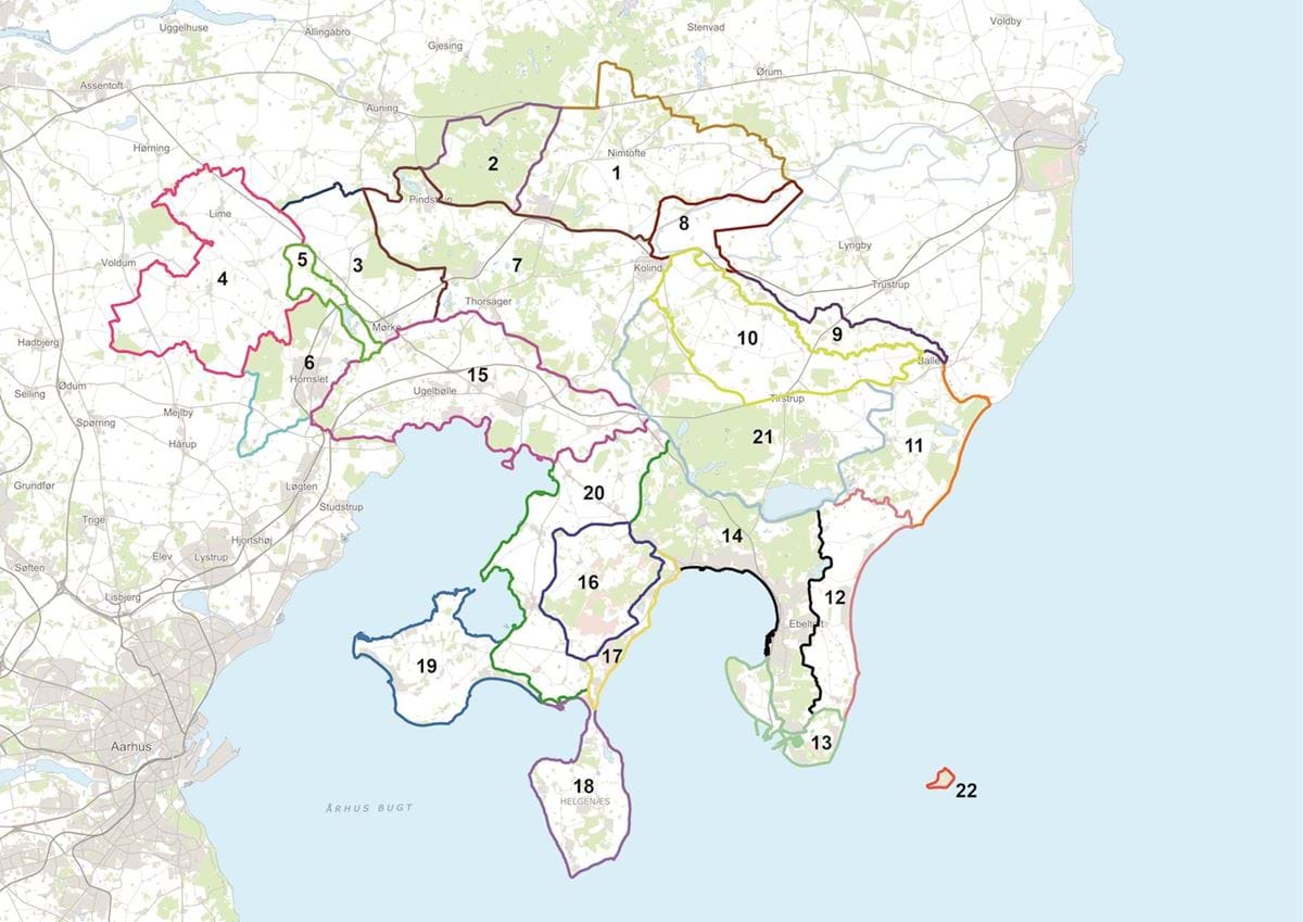 Kort over de 22 landskabsområder i Syddjurs kommune
