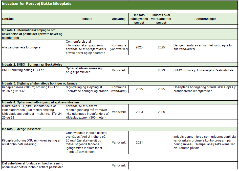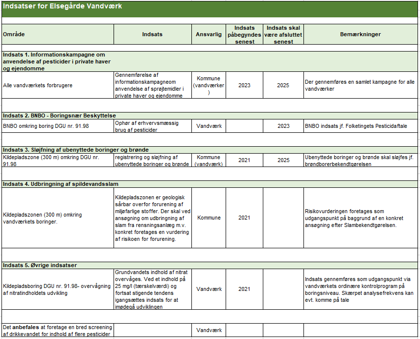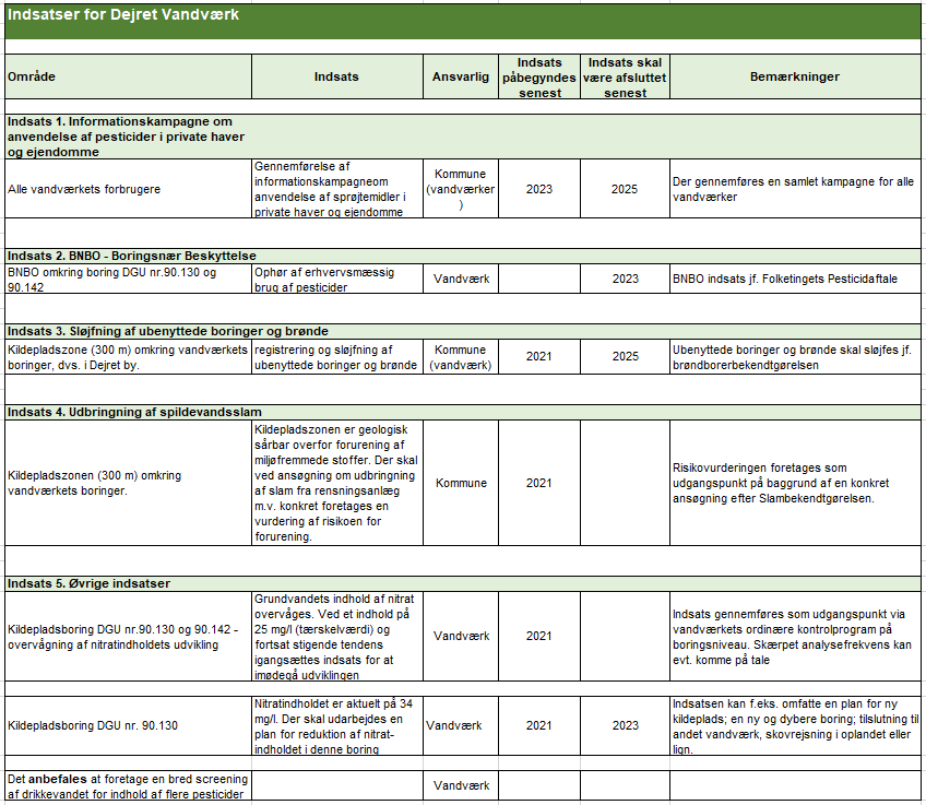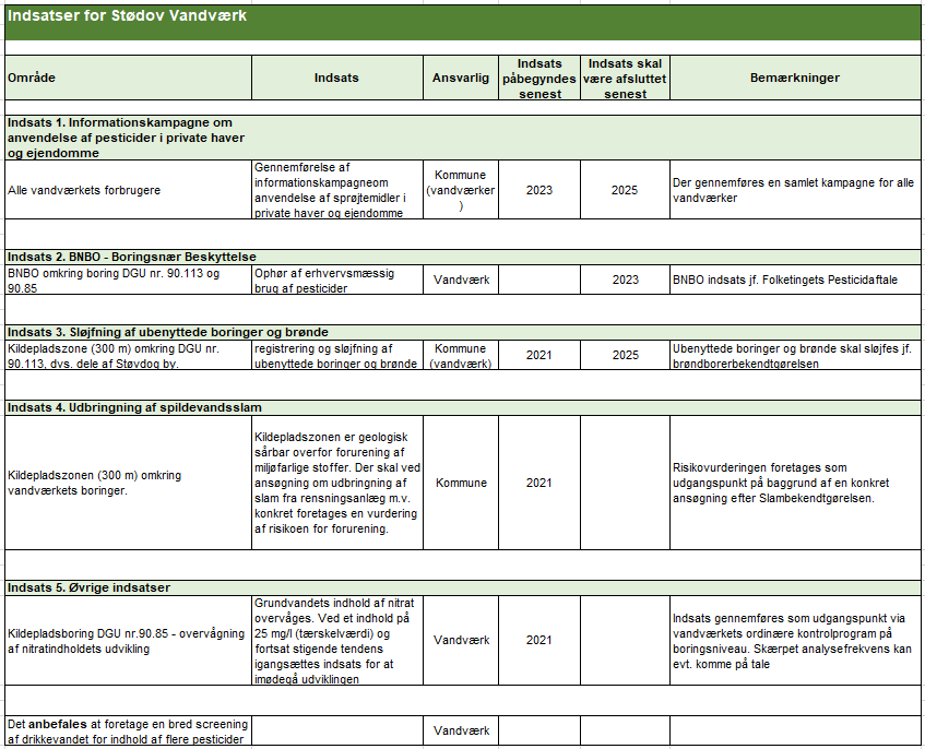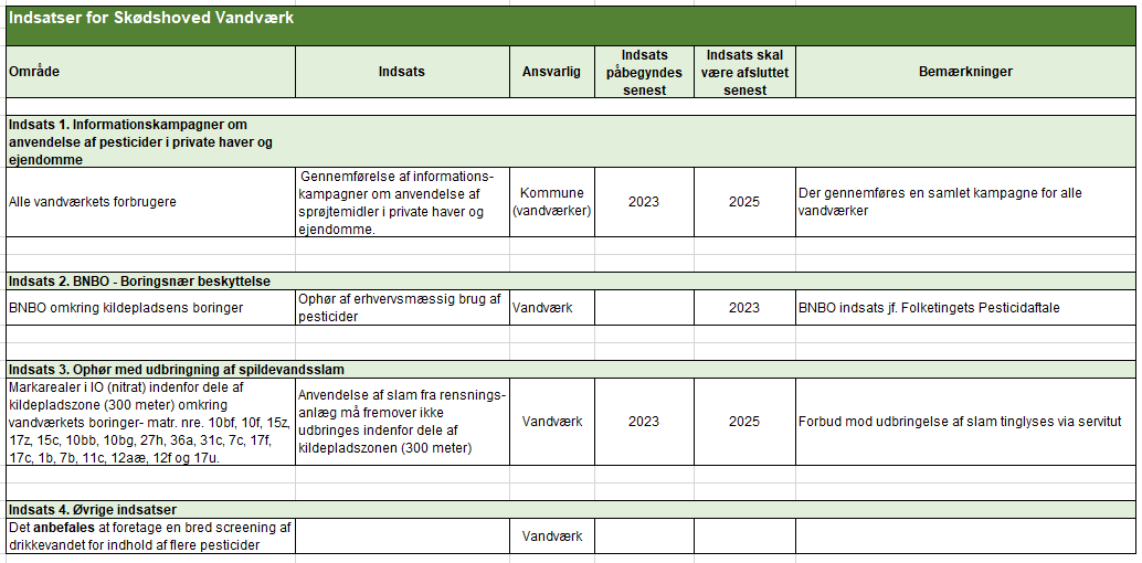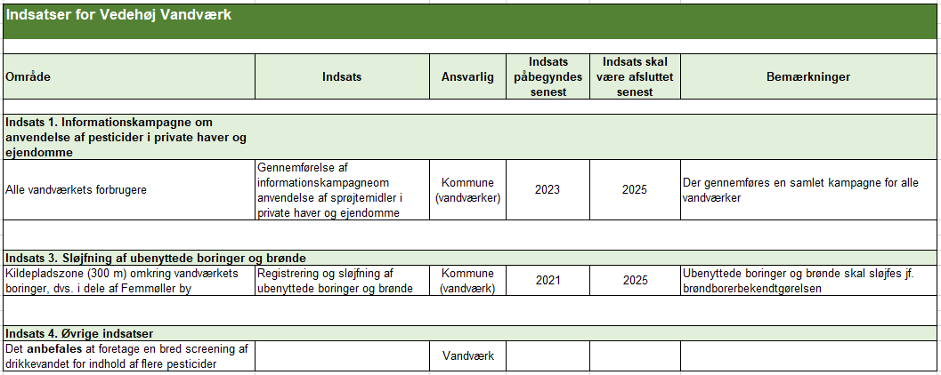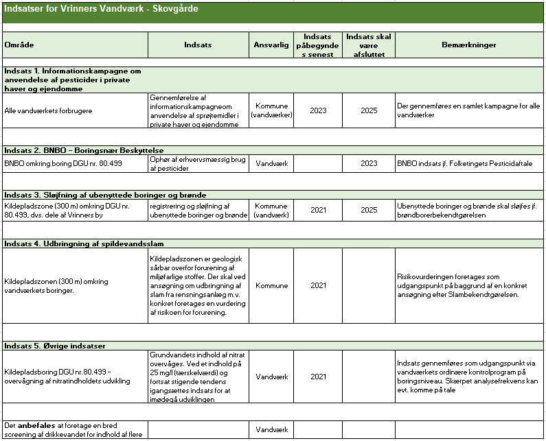 Vandværkets indvinding er knyttet til en velbeskyttet grundvandsressource, og hvor store dele af oplandet udgøres af Søndre Plantage. Det vurderes derfor, at der ikke er et aktuelt behov for indsats mod nitrat i det udpegede indsatsområde.