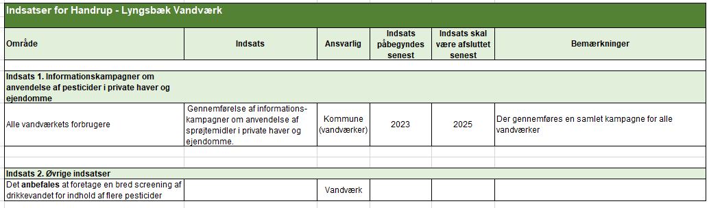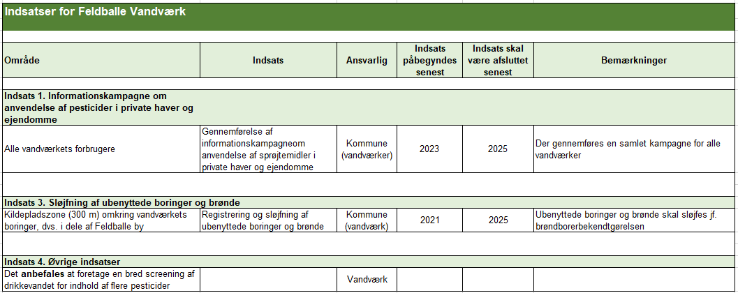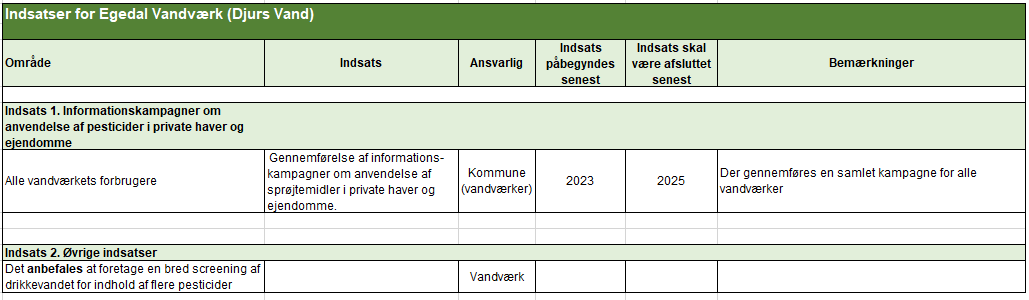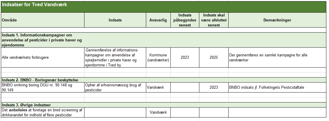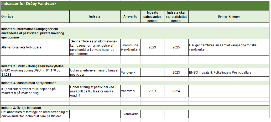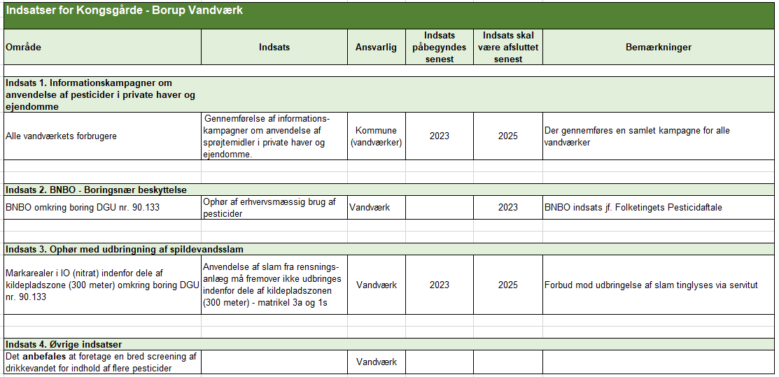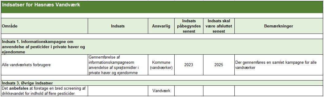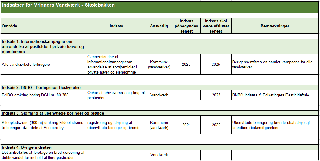 Vandværkets indvinding er knyttet til en velbeskyttet grundvandsressource, og hvor store dele af oplandet udgøres af Søndre Plantage. Det vurderes derfor, at der ikke er et aktuelt behov for indsats mod nitrat i det udpegede indsatsområde.