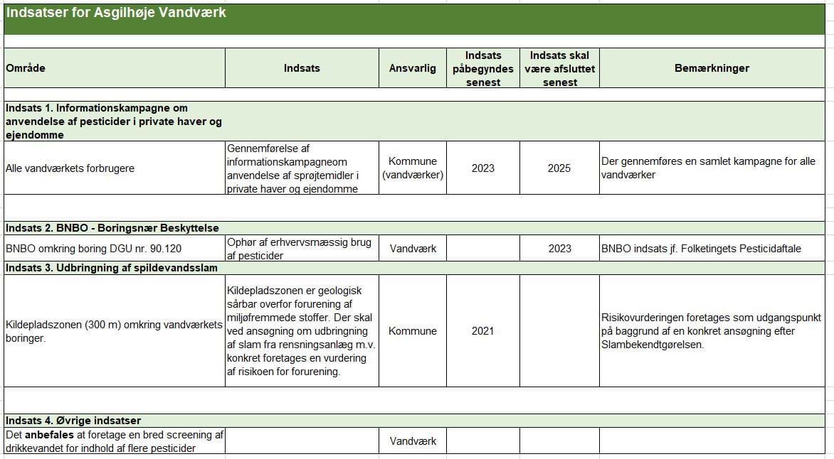 I vandværkets opland er der udlagt mindre indsatsområder mod pesticider. Disse områder ligger dog i relativ stor afstand til Asgilhøje Vandværks kildepladsboring, hvorfor det vurderes, at der aktuelt ikke er behov for konkrete indsatser mod pesticider i disse områder.