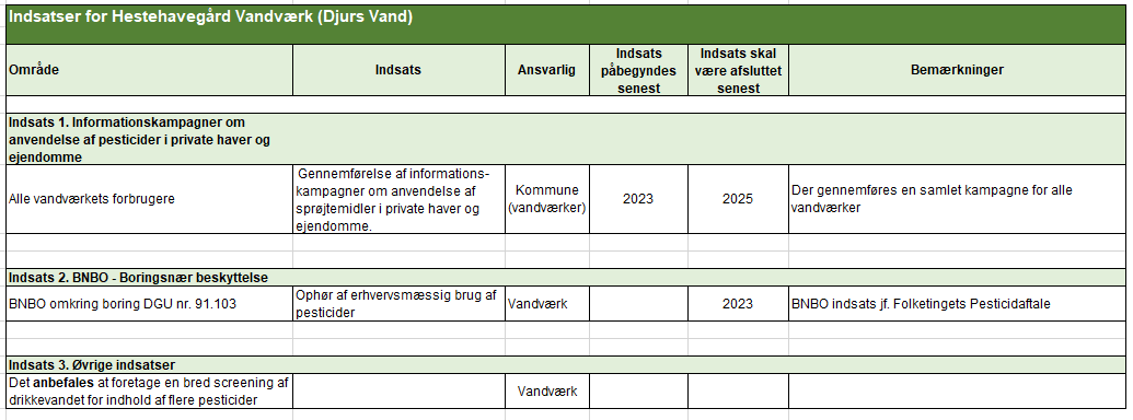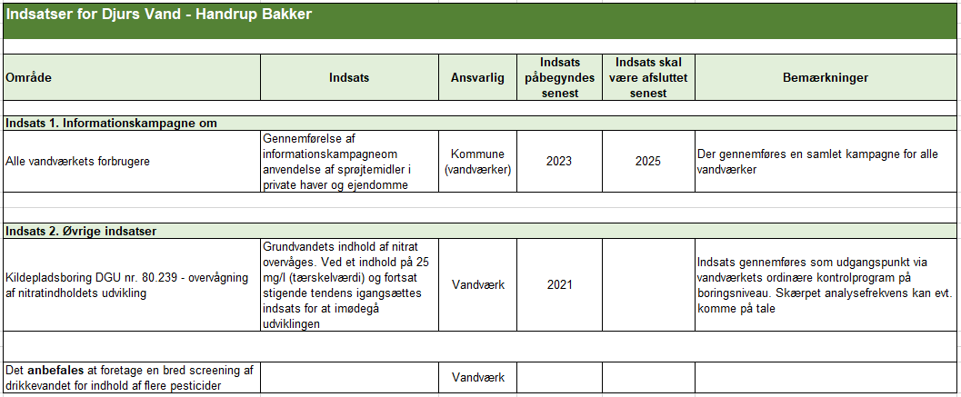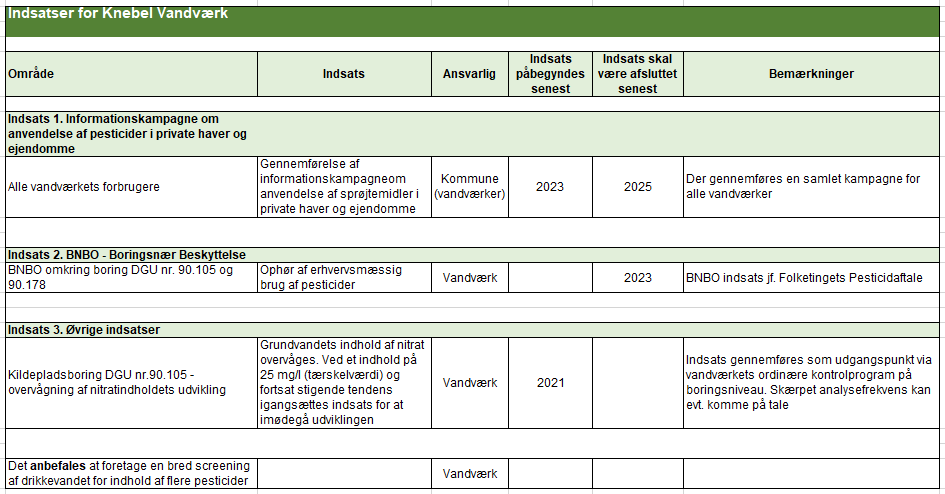 Det indvundne grundvand er generelt knyttet til et grundvandsmagasin med god naturlig beskyttelse mod nitrat, hvorfor det vurderes, der ikke er et aktuelt behov for indsats mod nitrat i det udpegede indsatsområde.