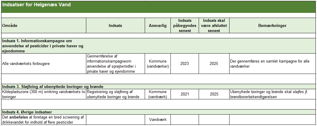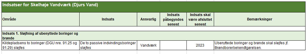Det indvundne grundvand er knyttet til et velbeskyttet grundvandsmagasin, hvorfor der ikke er et aktuelt behov for indsats mod nitrat i det udpegede indsatsområde.