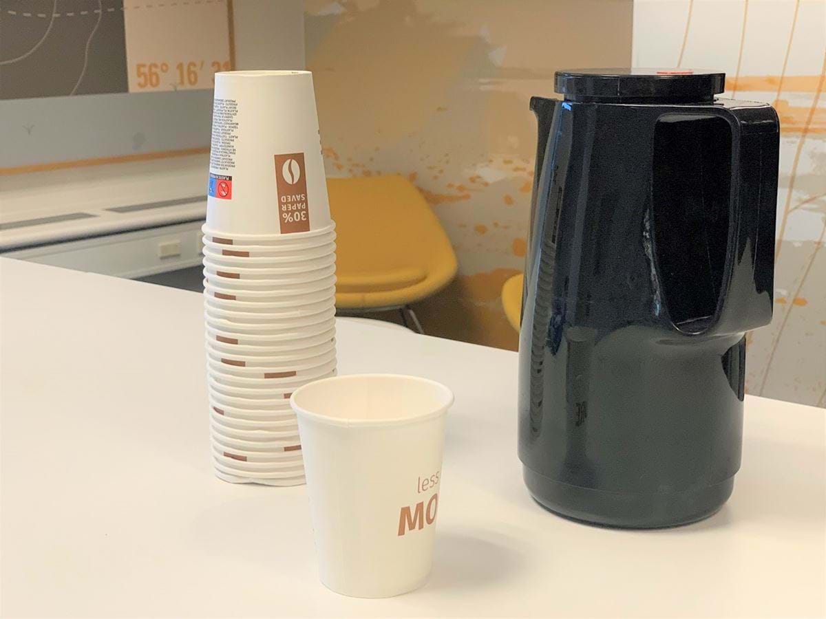 Pågående indsats. Der er allerede succeser med besparelse fx i kantinedriften på Rådhuset i Ebeltoft. Hvor opvask af medarbejderkrus frem for anvendelse af papkrus, giver en besparelse på ca. 4.000 kr. ugentligt. Samtidig med en affaldsbesparelse på de ca. 4.000 papirkrus.