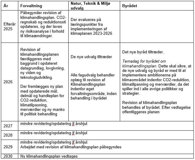 Planen revideres gennemgribende hvert 4 år for at være tidssvarende ift. udvikling indenfor lovgivning, rammevilkår, nye handlemuligheder, teknologi/data herunder opdaterede klimamodeller og den generelle samfundsudvikling samt evt. nye klimaudfordringer. Det sikrer, at klimahandlingsplanen er aktiv, operationel og dynamisk. Næste revision godkendes i 2026 jf nedenstående revisionsplan.