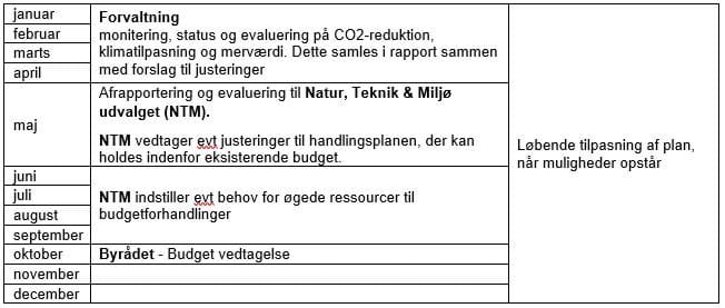 Moniteringen bruges bl.a. til en årlig evaluering af klimahandlingsplanes målsætninger, mål, handlinger og budget, så vi kan kvalificere arbejdet undervejs og tilpasse handlinger efter ny viden mv. For at sikre sammenhæng med investeringsoversigten og den årlige budgetproces præsenteres årligt én samlet sag i starten af året med afrapportering fra året, der gik, og forslag til evt. tilpasninger til politisk behandling, så angivet i nedenstående årshjul.