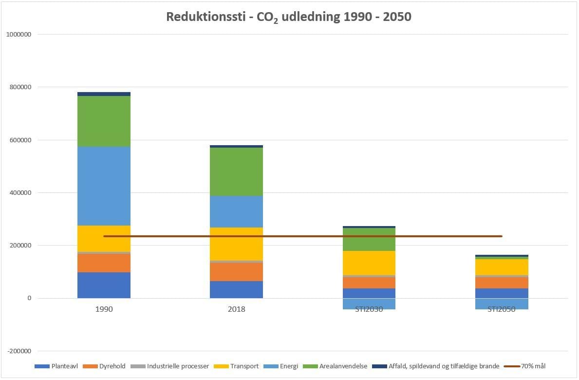Med vores handleplan når vi de 70 % i 2030, mens der i 2050 er en Manko på ca. 120.000 tons CO2, hvor der endnu ikke er lavet tilstrækkelige aftaler for reduktion.