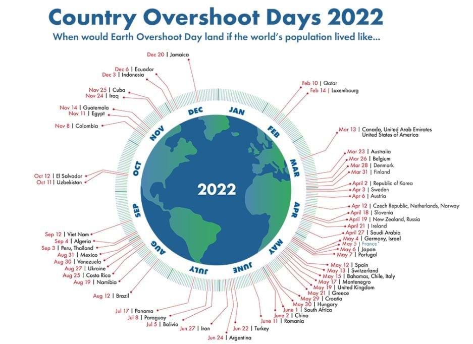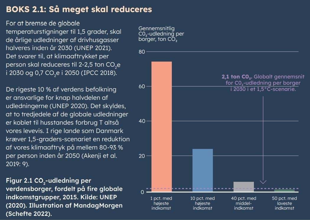 Forbrug af ressourcer opgøres hvert år i Earth Overshoot Day (figur 1.3), der i 2022 viser, at Danmark ligger i toppen ved at have opbrugt ressourcerne fra 2022 allerede i marts måned. Altså ville jordens befolkning have brug for 4 jordkloder, hvis alle levede som danskere. Beregninger viser, at den gennemsnitlige udledning er på ca. 17 tons pr. dansker (figur 1.4).