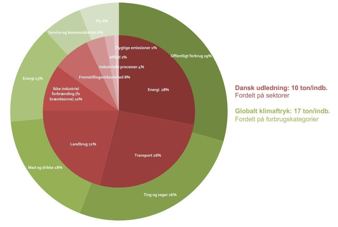 På nuværende tidspunkt udleder vi lokalt i Syddjurs Kommune 13,5 tons CO2 pr. indbygger om året (ekskl. forbrug), hvor målet i 2030 er 5 tons CO2 pr. indbygger. Det er lavere end landsgennemsnittet, men stadig et stykke fra målet. Dertil kommer indbyggernes andel af den nationale og internationale udledning.
