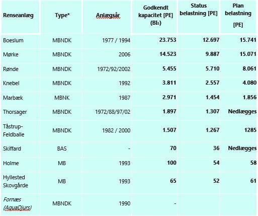 I tabellen på næste side ses en oversigt over de 10 renseanlæg med anlægstype og år, kapacitet og belastningen i hhv. status og plan.